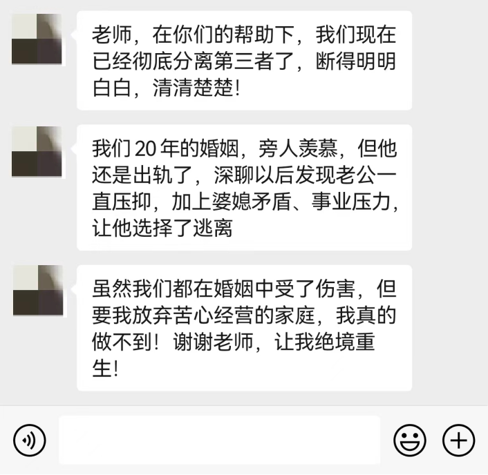 面对出轨的丈夫,来访者在咨询的过程中都非常冷静,跟着幸福有方老师提供的方法,一步一步地跟丈夫沟通,最终彻底的分离了第三者,两人重归于好,20年的婚姻得以延续。