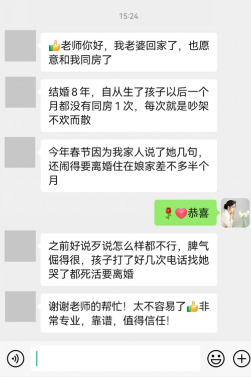 按照方法,来访者去跟老婆沟通协商,表达自己没有了解她在养育孩子以及工作上压力是自己的失责,而来访者老婆本身也没有想要离婚的打算,提出离婚只是当时气在心头的气话,经过沟通与互相体谅,两人重归于好,感情也得到了重建。
