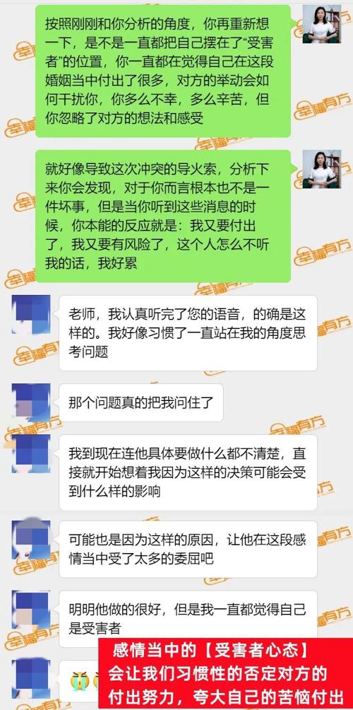 在这个案例当中,通过和咨询对象的沟通,我们发现女学员长期都处在十分严重的“受害者思维”当中: