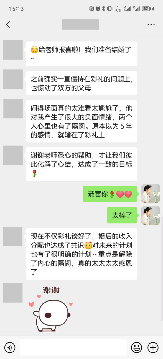 刚开始来访者还始终不肯接受幸福有方老师的分析与建议,但在幸福有方老师多次深入的分析与耐心的交流下,来访者发现自身确实与男朋友有比较大的差距,最后也妥协不再要求高彩礼与婚房加名,男朋友在看到来访者的转变后,也主动与来访者重归于好。