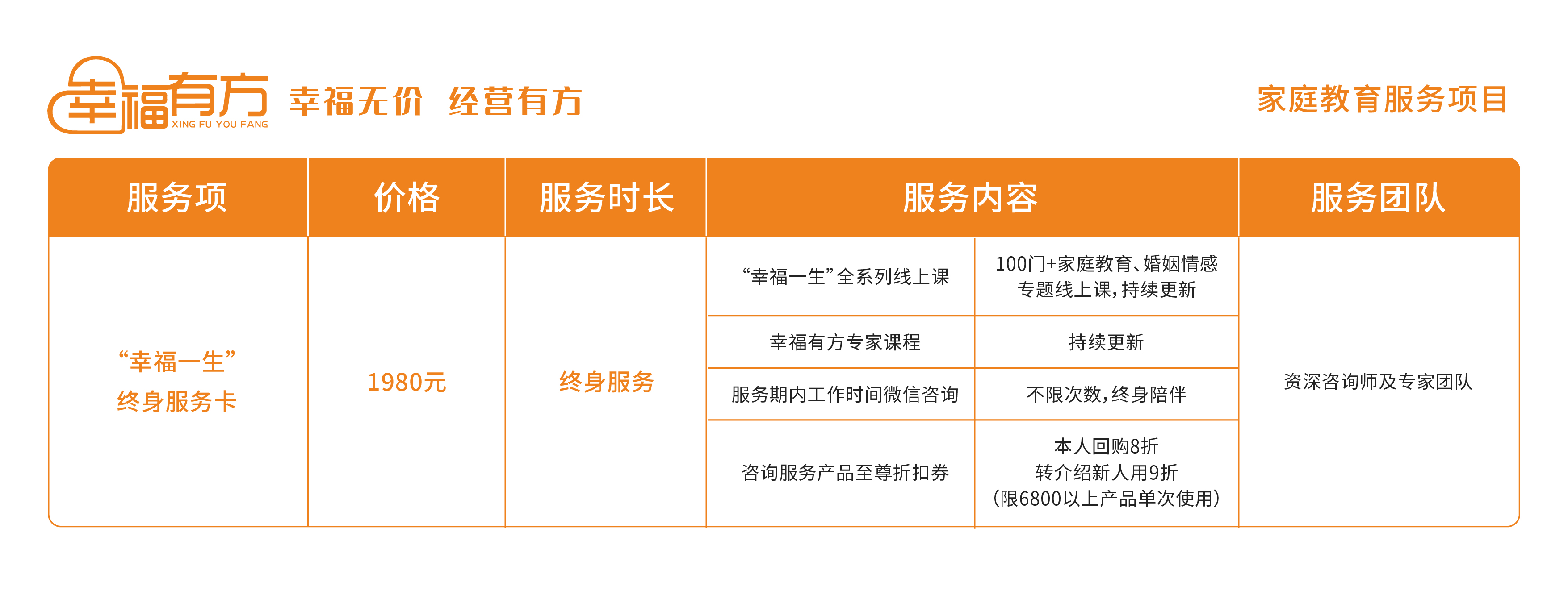 以下为幸福有方服务价格,无论是家庭亲子问题相关咨询,还是夫妻情感相关问题咨询。幸福有方承诺,每份服务明码标价,无隐形、无诱导消费。